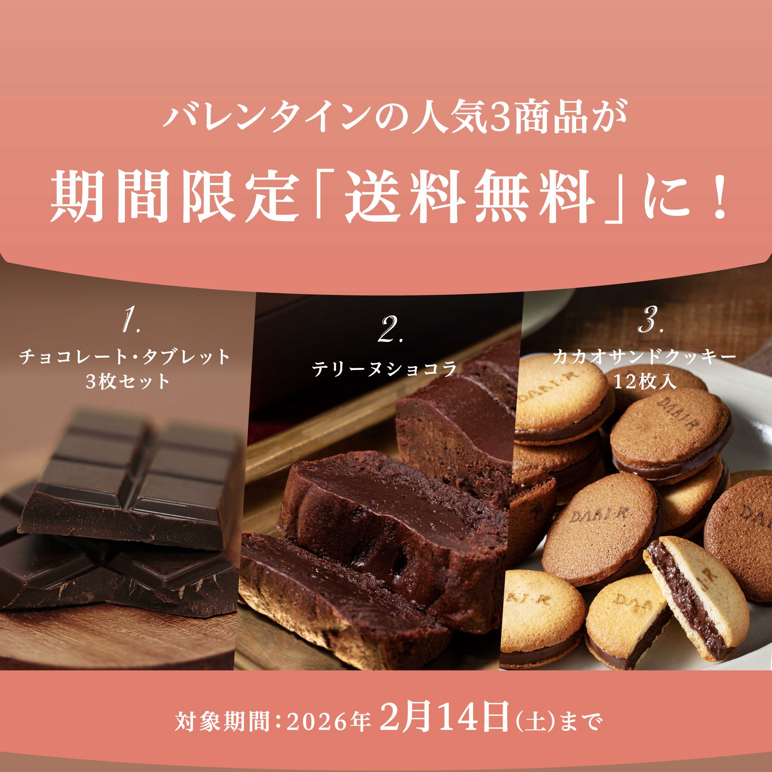 バレンタイン人気3商品、が期間限定送料無料!タブレット3枚セット・テリーヌショコラ・カカオサンドクッキー12枚入をお得にご購入いただけます。2月14日バレンタインデー当日のお届けは2月10日まで!お早めにどうぞ。