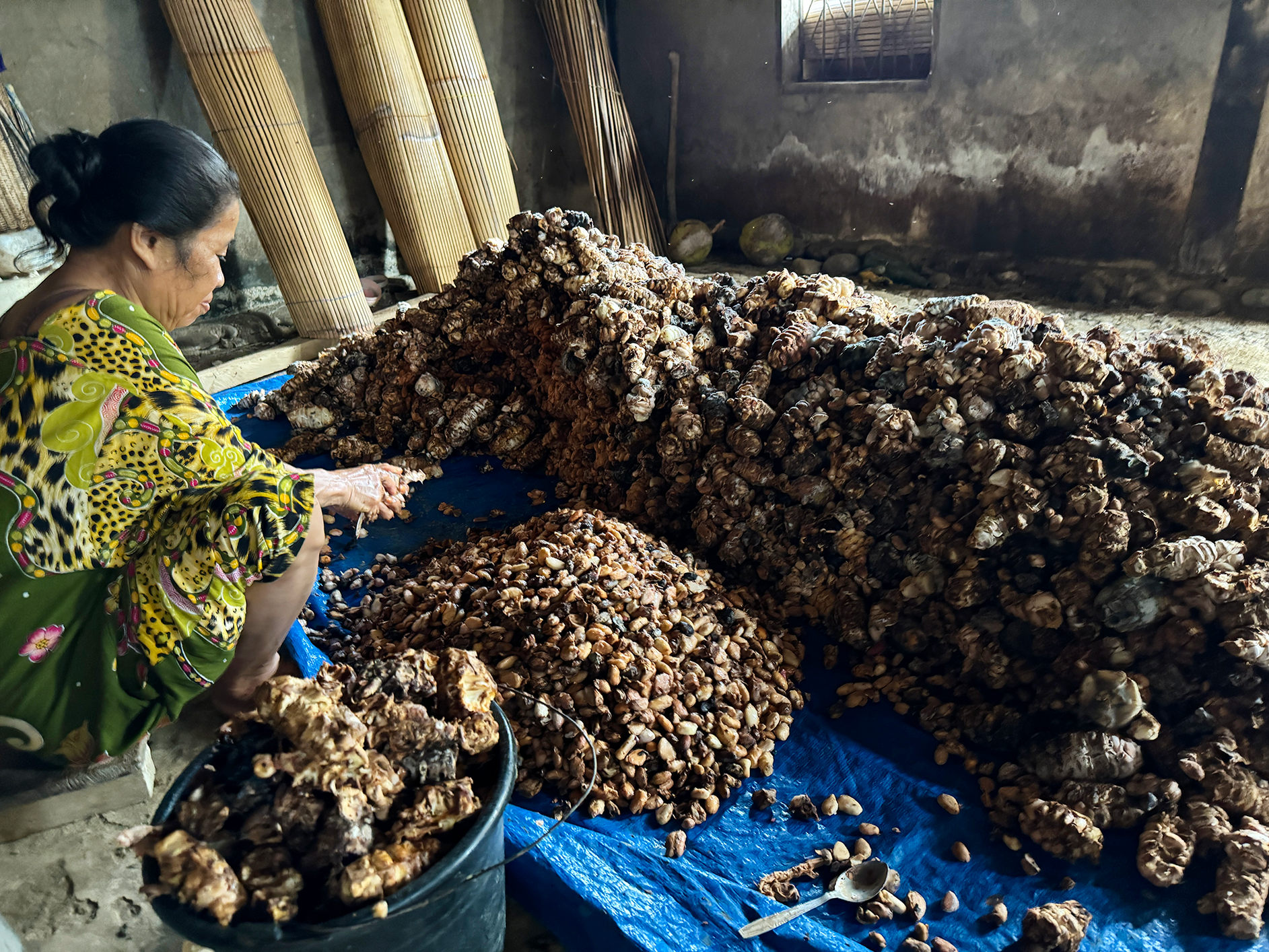 こちらの写真は、害虫被害にあった大量のカカオ豆の中から、出荷可能な豆を一粒一粒、選別している様子です。こうした害虫問題の放置は、生産者の現金収入の減少だけでなく、大変に負荷のかかる作業をカカオ農家に強いることになります。