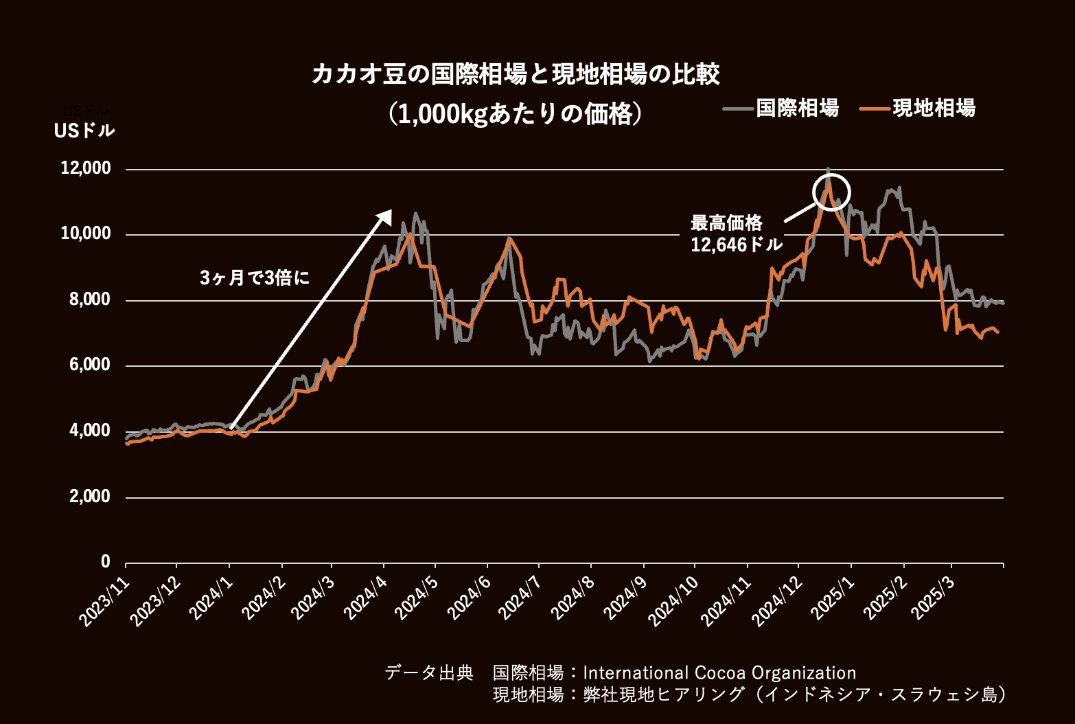 西アフリカでの病害虫や気候変動の影響が原因とされ、供給不安は世界規模に広がっています。