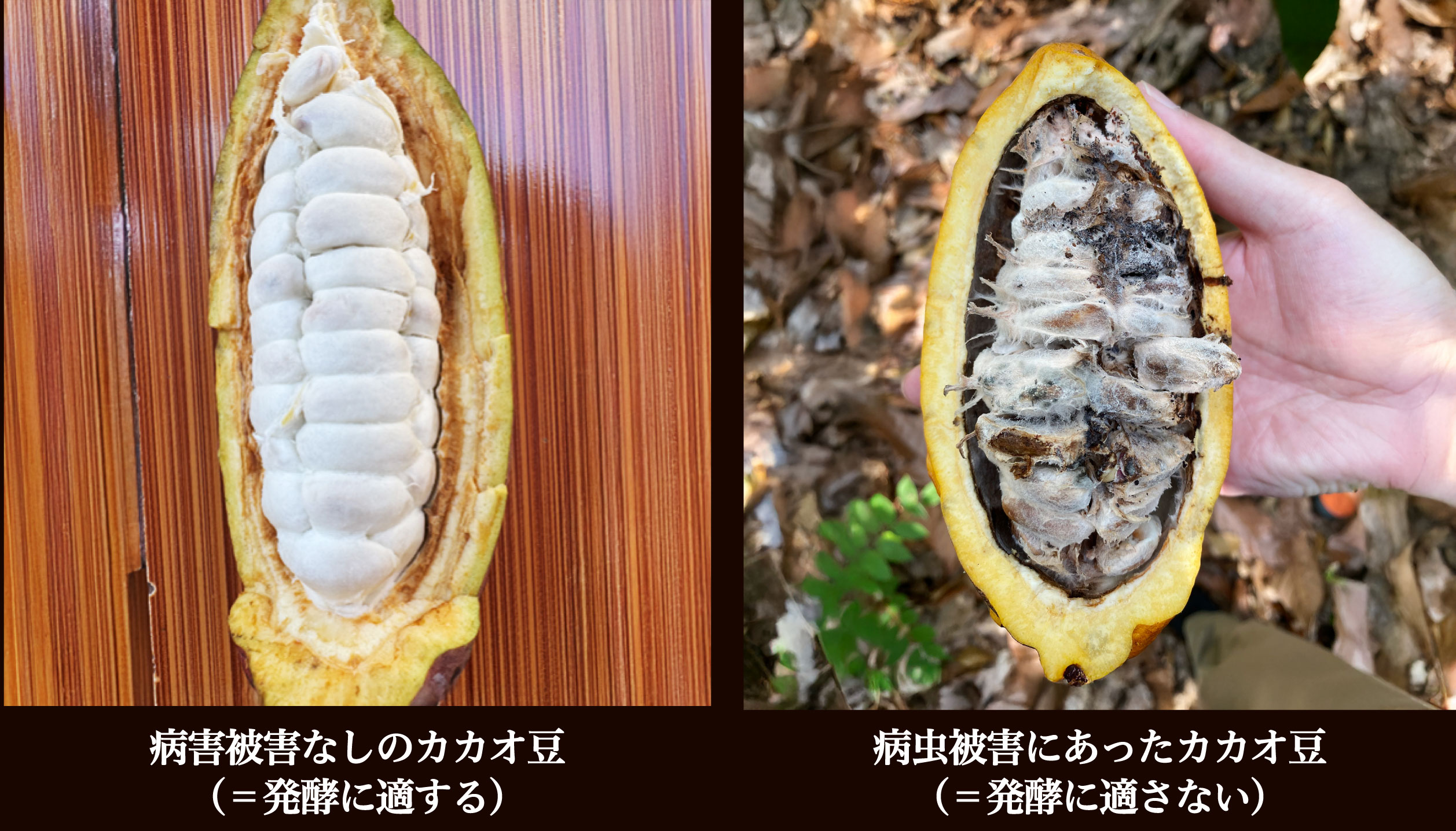 そのため、害虫による被害は、農家が数か月にわたる栽培や手入れを行った後になってから、カカオの収穫のときにはじめて、しかも、少しずつ明らかになっていきます。