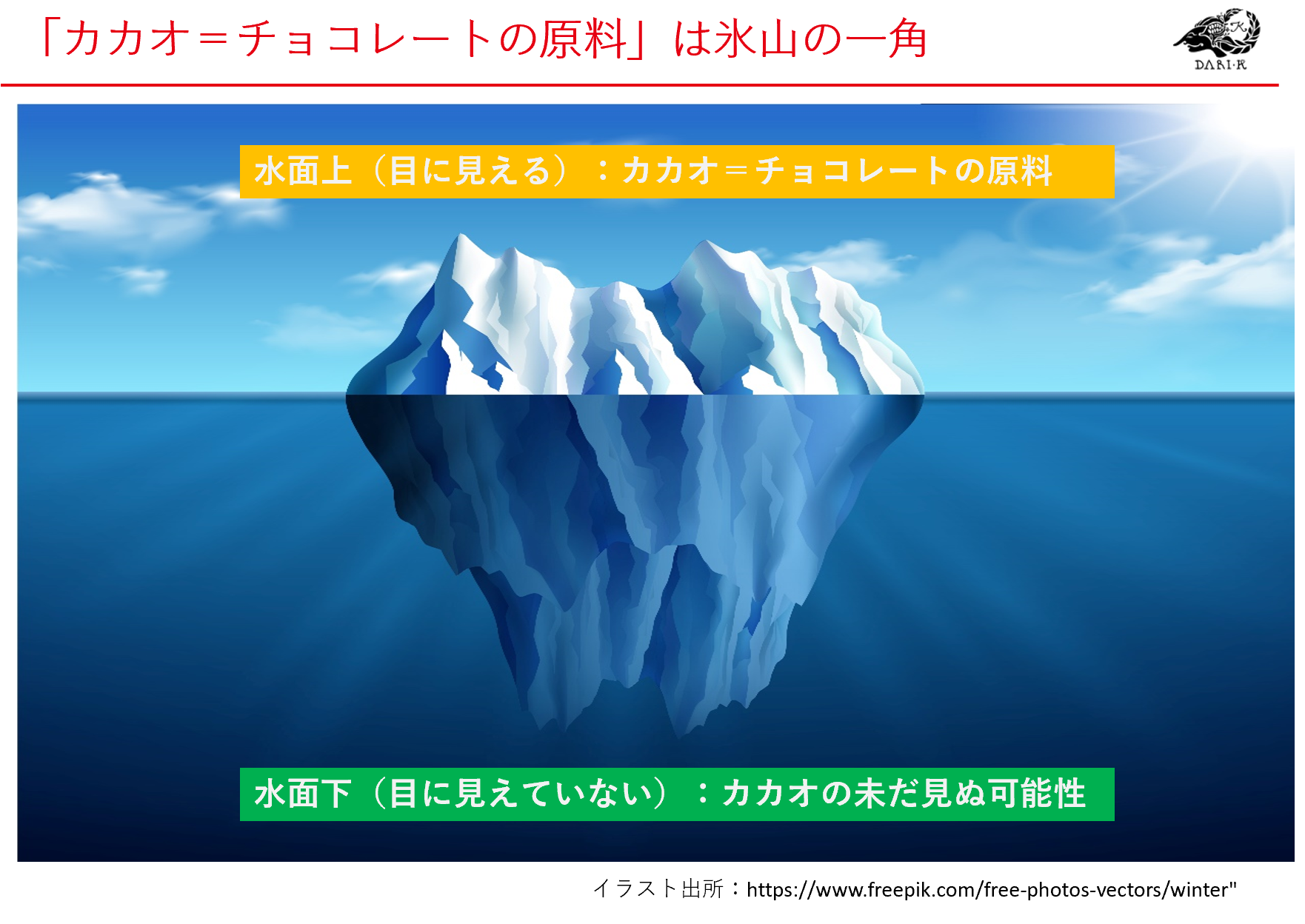 世間にとってカカオはチョコレートの原料に過ぎないけれど、カカオの可能性は水面下に沢山眠っています。その眠っている(まだ世間に知られていない)価値を、Dari Kは現地での様々な活動によってこれまで探ってきました。2020年は、この水面下に潜むカカオの価値・可能性を水面上に出すチャレンジをしたいと思っています!(よろしければTKC「戦略経営者」掲載の今どきのソーシャルビジネス “カカオ革命”を世界に…チョコレートショップの挑戦をご覧ください!)