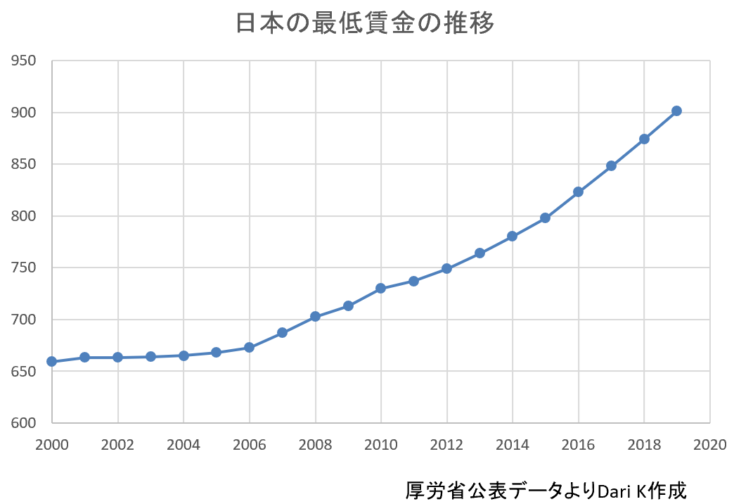 翻って下は同じ時期の日本の最低賃金の推移を表したもの。国として1人当たりGDPは過去20年変わっていないのに、最低賃金つまり非正規雇用のアルバイトに払う賃金はまるで新興国並みに毎年上がっています。経済全体が良くなっていない、創出する付加価値が増えていないのに、人材不足や、働き方改革、正規=非正規間の格差縮小という大義の元に単純労働者の賃金が増加しています。生産性の向上が伴わない=付加価値が増えない=なのに企業の人件費負担は増える=利益が出ない=投資に回せない=付加価値創出が見込めない。いったいいつまでこのサイクルを日本は繰り返すのか?というか、なぜ今働き方改革なのか?