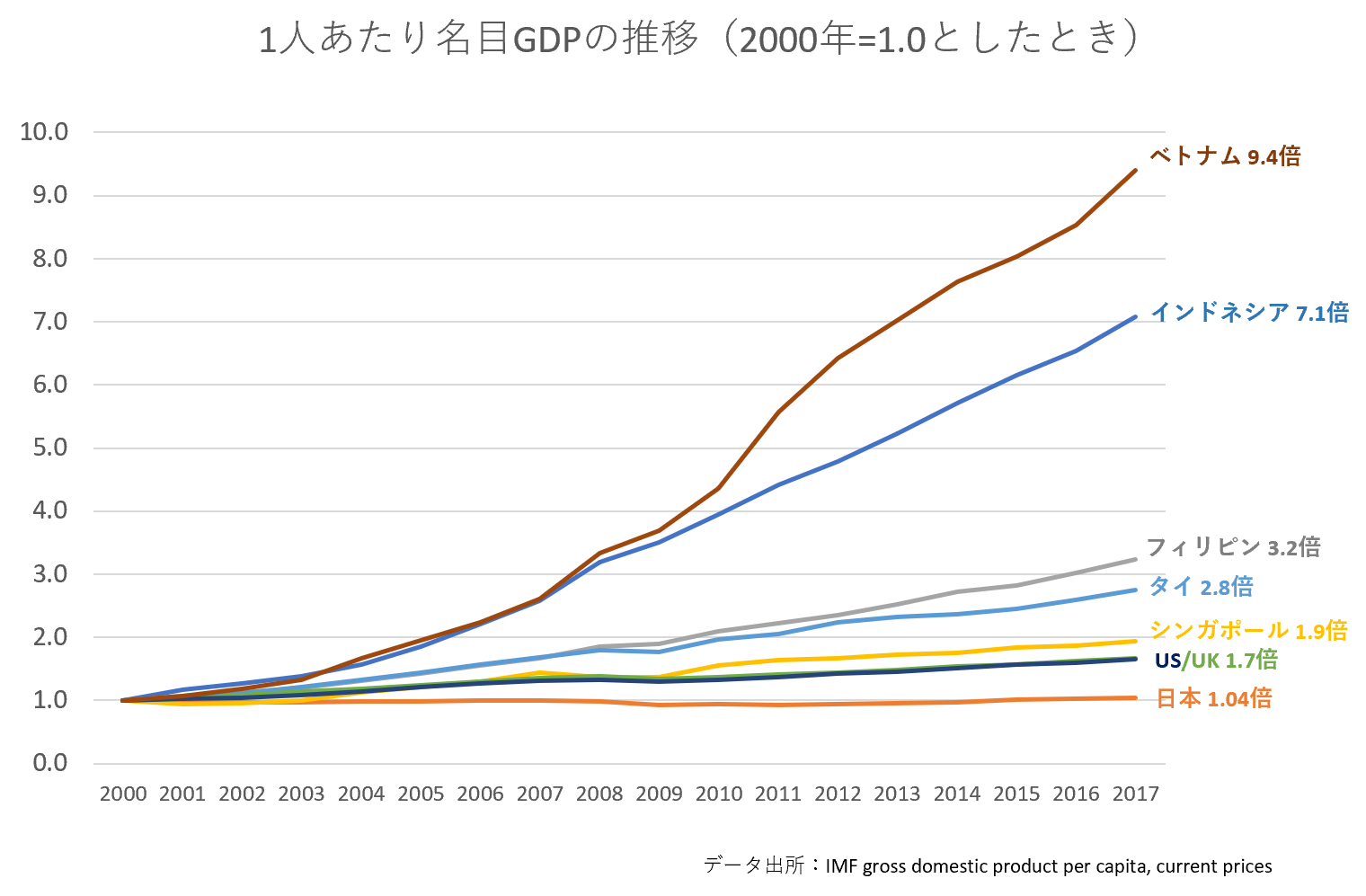 その上で改めてこのグラフを見ると、日本は過去20年弱、ほとんど所得は増えていません。一方で、ベトナムやインドネシア、その他ASEAN各国では著しい伸びを見ることができます。