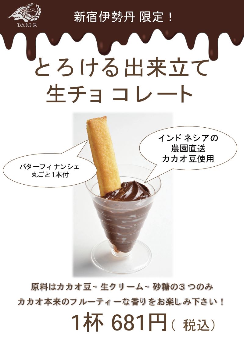 ※限定イートインメニュー「出来立てガナッシュ」「ホットチョコ」あります