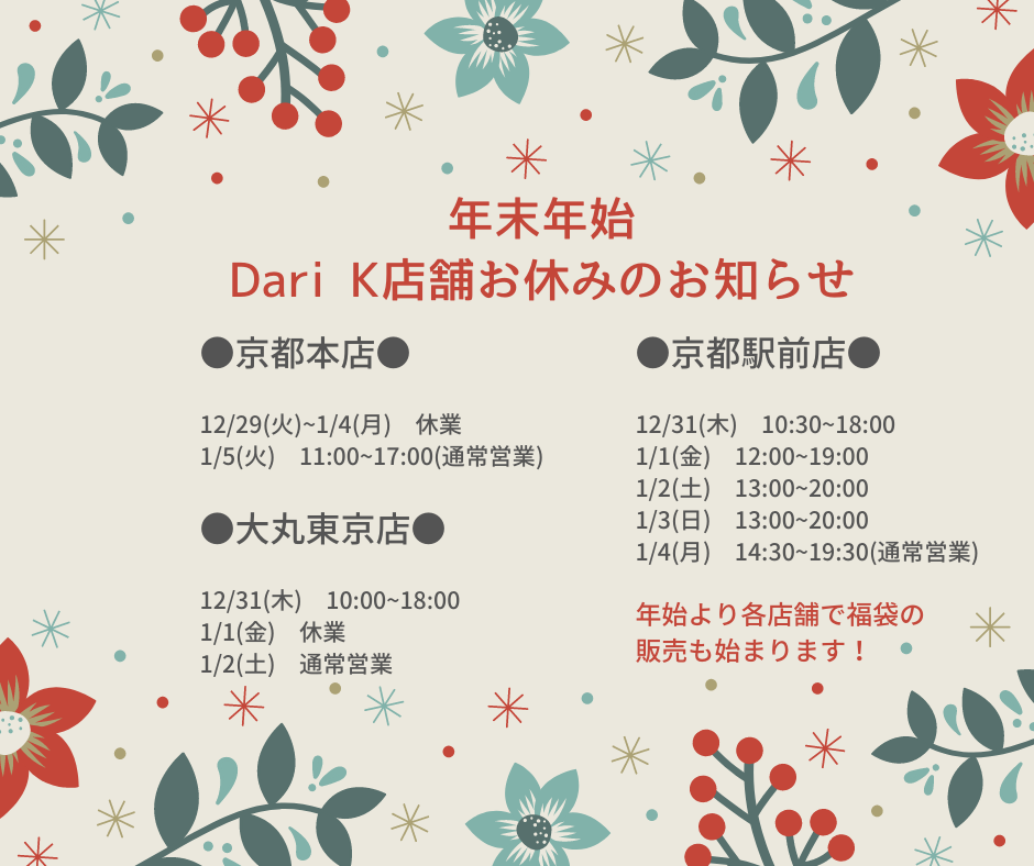 新着情報 【訂正】年末年始のお休みについて 2020年12月14日 年末年始の各店の営業につきまして、変更がございましたので、ご案内いたします。 休業期間中はご不便をおかけいたしますが、何卒よろしくお願い申し上げます。 年明けより各店舗で福袋の販売を行います。 皆様のご来店をお待ちしております。